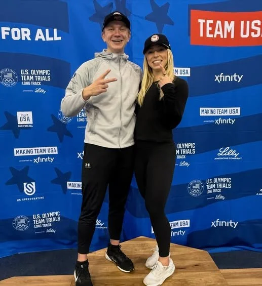 Ethan Cepuran (left) will be going to his second Olympic Games. He will be skating in the Mass Start and Team Pursuit. Sarah Warren (right) will be going to her first Olympic Games and will be skating the 500 meters